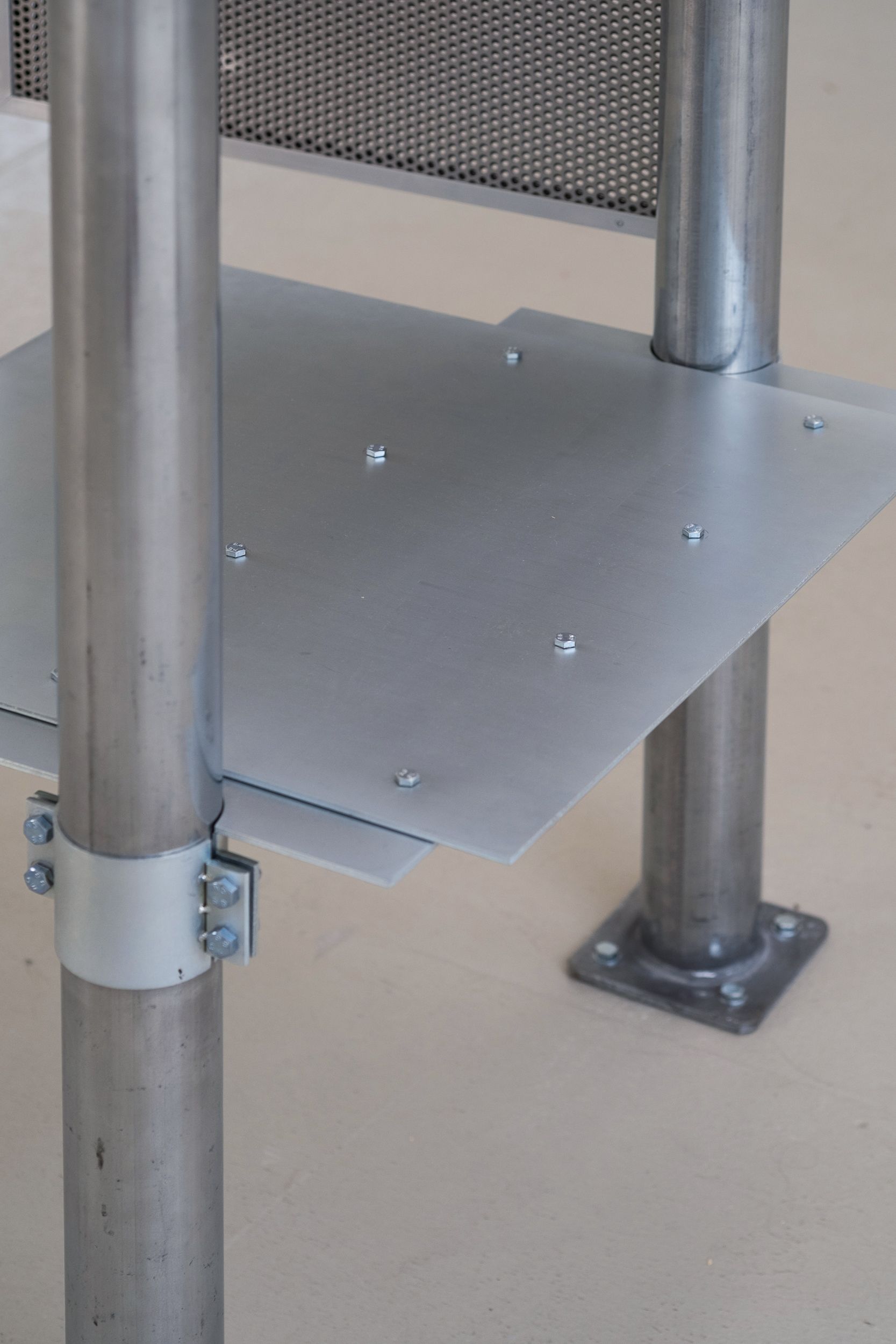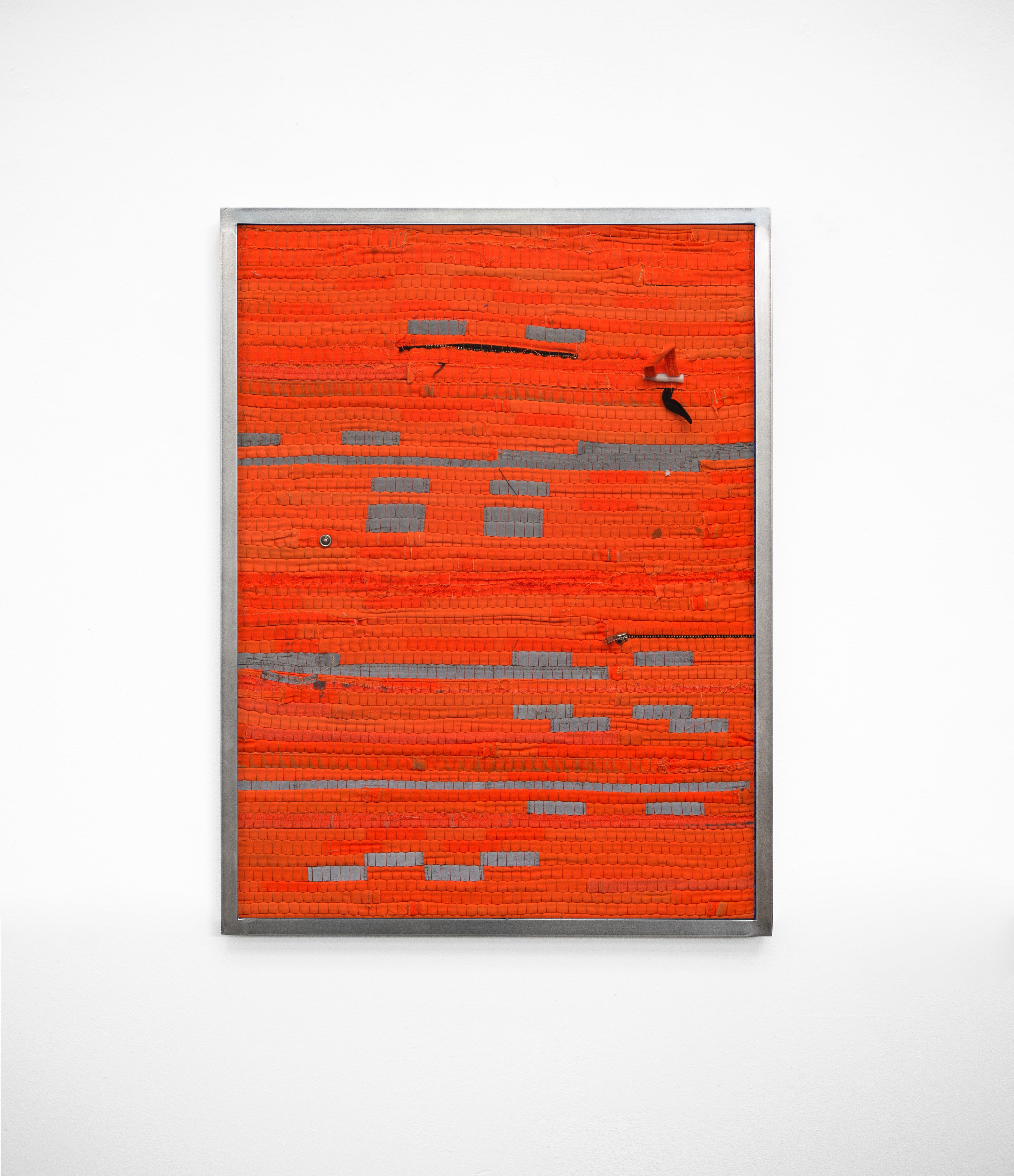 Overalls 18-22 2024. Reflective vest, cotton thread, and powdercoated steel. 40 x 32 x 2,5 cm.