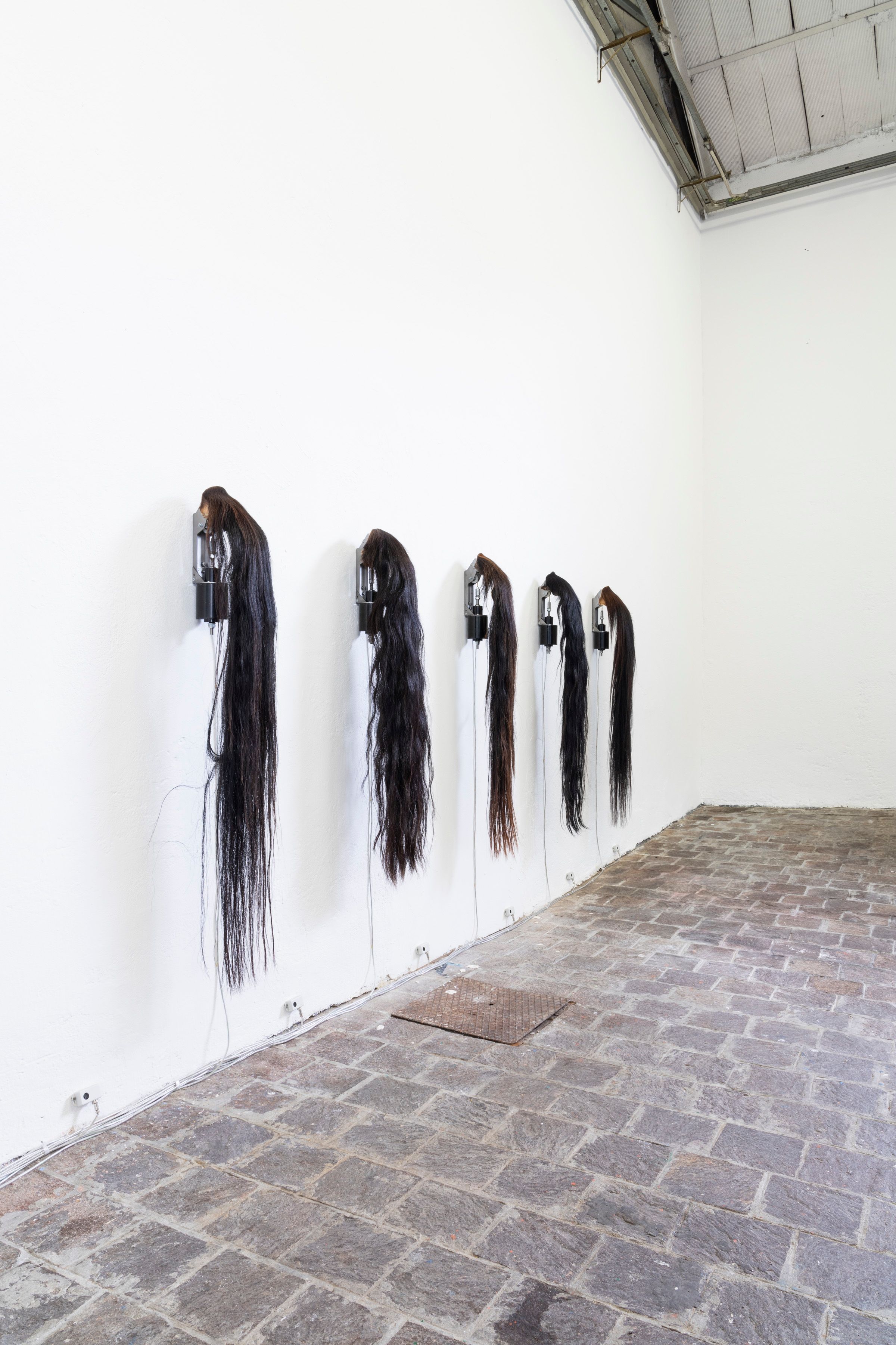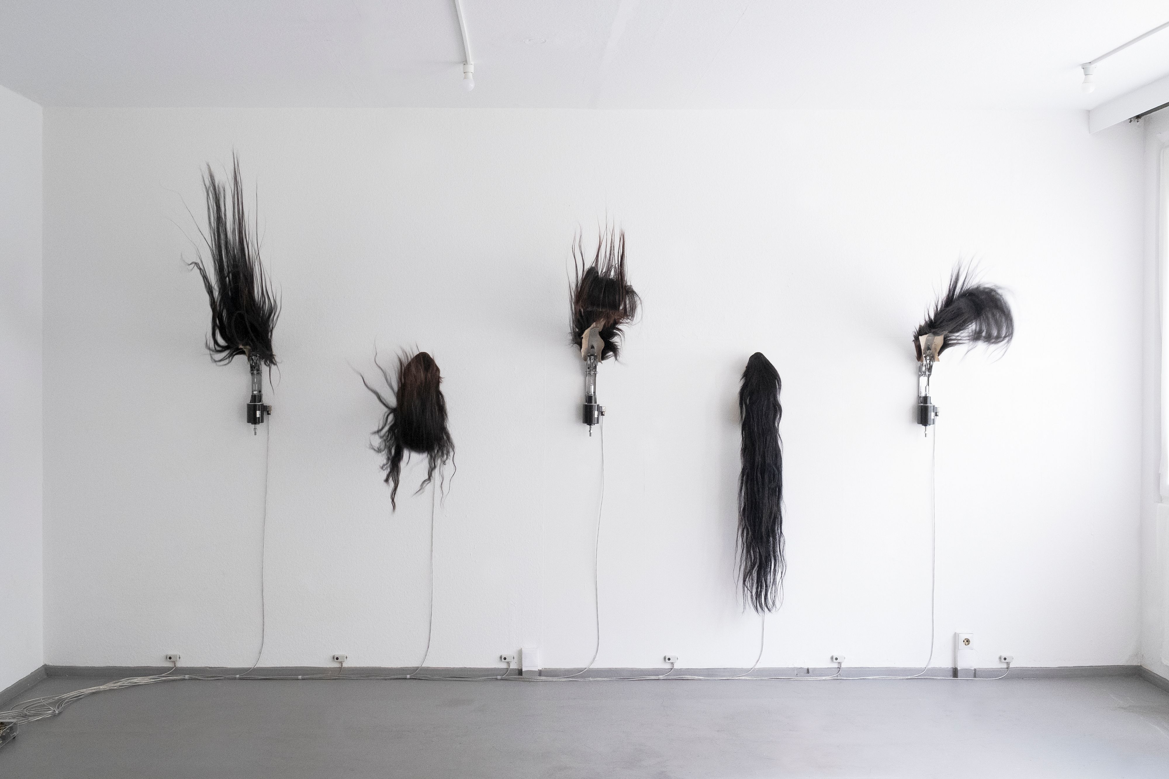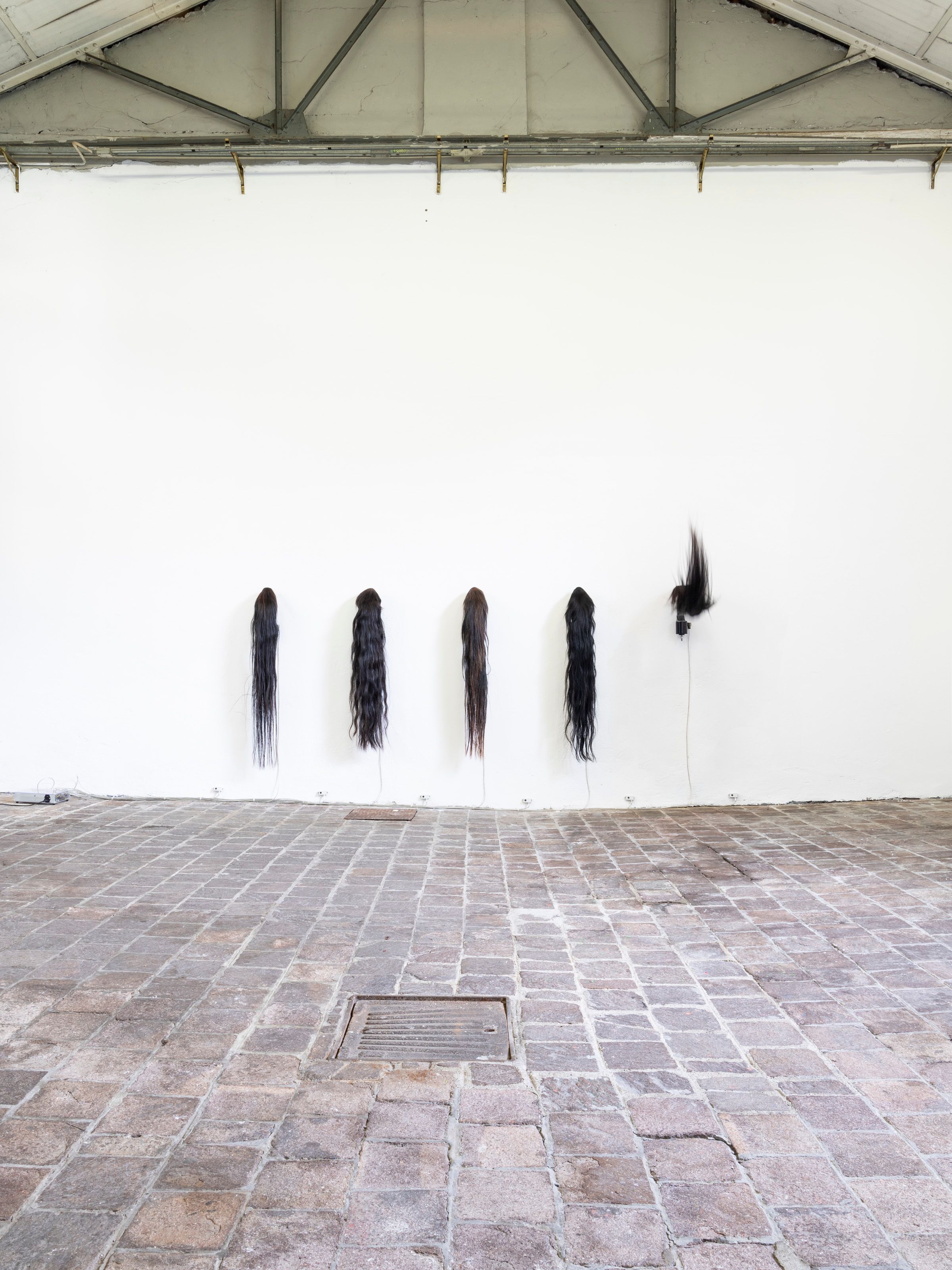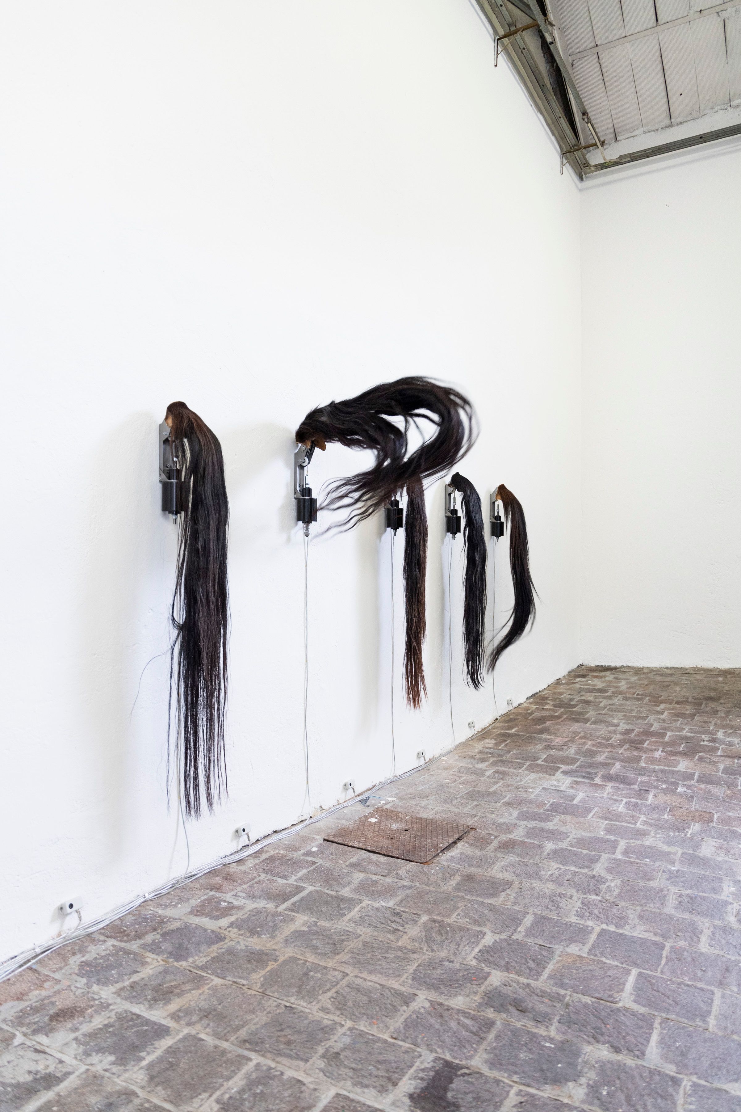 The interactive installation About desire consists of five horsetails suspended vertically on the wall and separated equidistantly from each other. The tails, connected to a system of pre-programmed movement sensors, shake intermittently and without any temporal correspondence, simulating the natural movements of the animal. This movement is interrupted when the spectators approach the piece and reactivated again when they distance themselves from the installation.