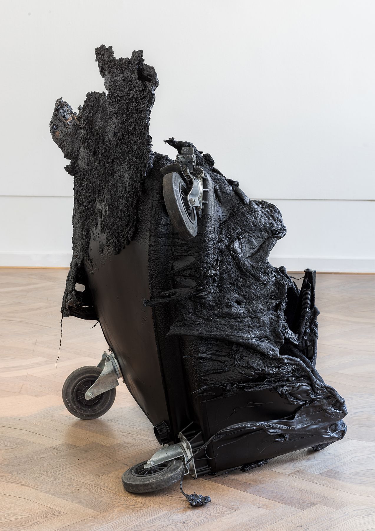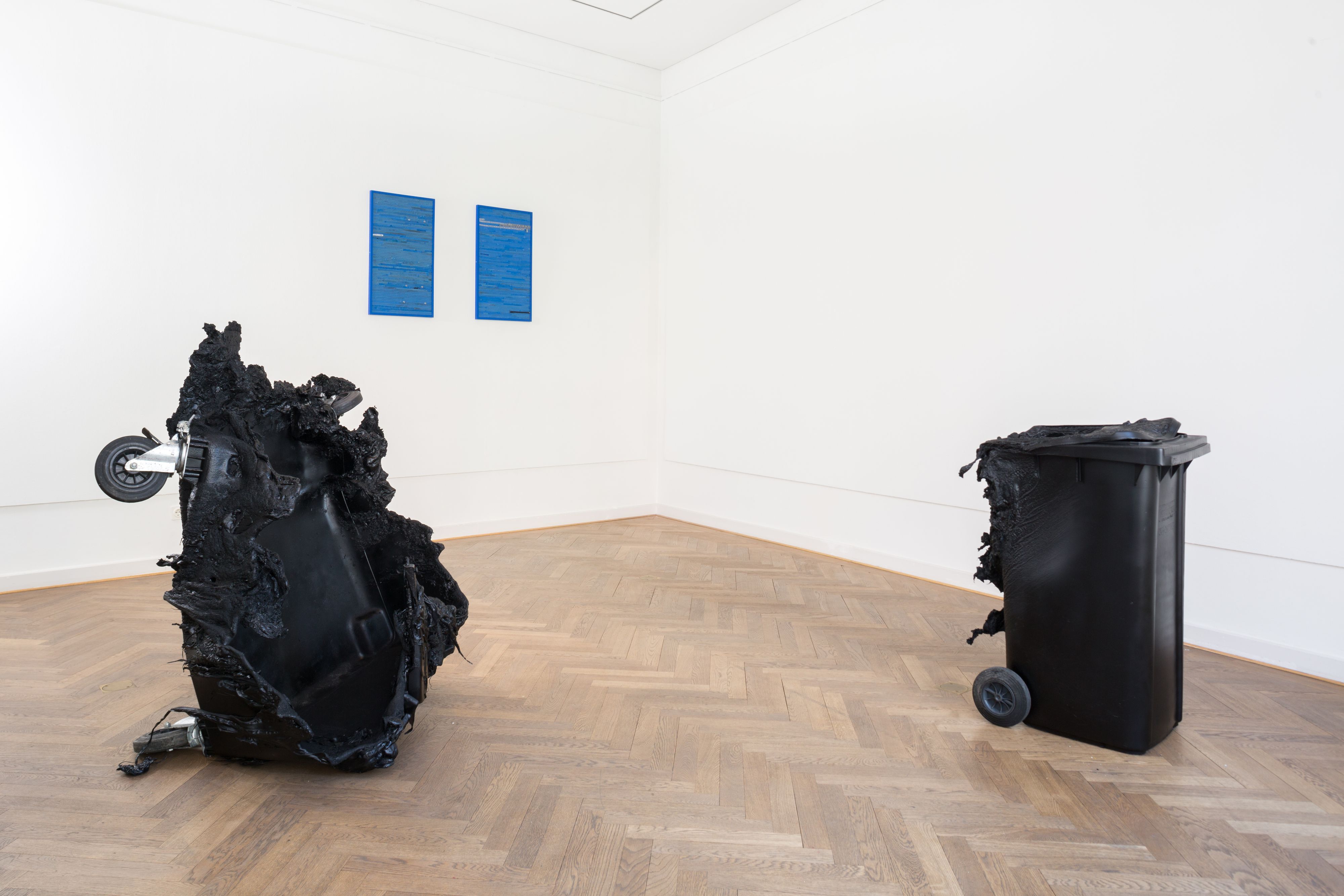 FROHES NEUES JAHR (happy new year) 2024, Two burned trash bins. 133 x 110 x 85 cm. and 107 x 60 x 74 cm.