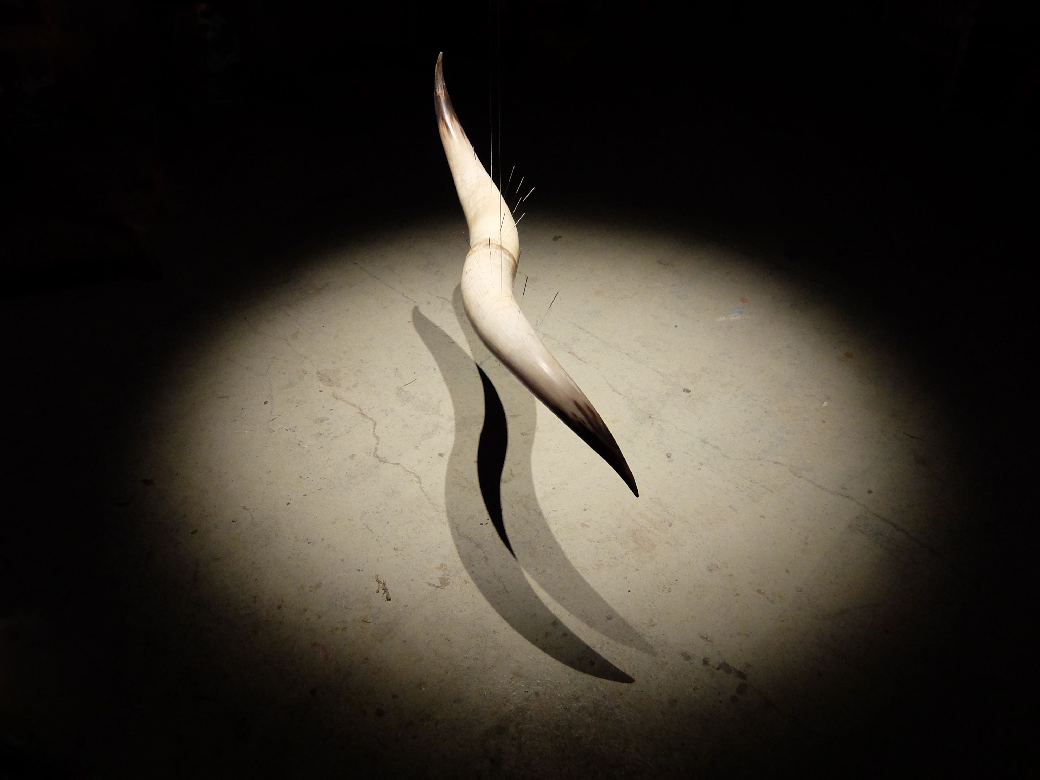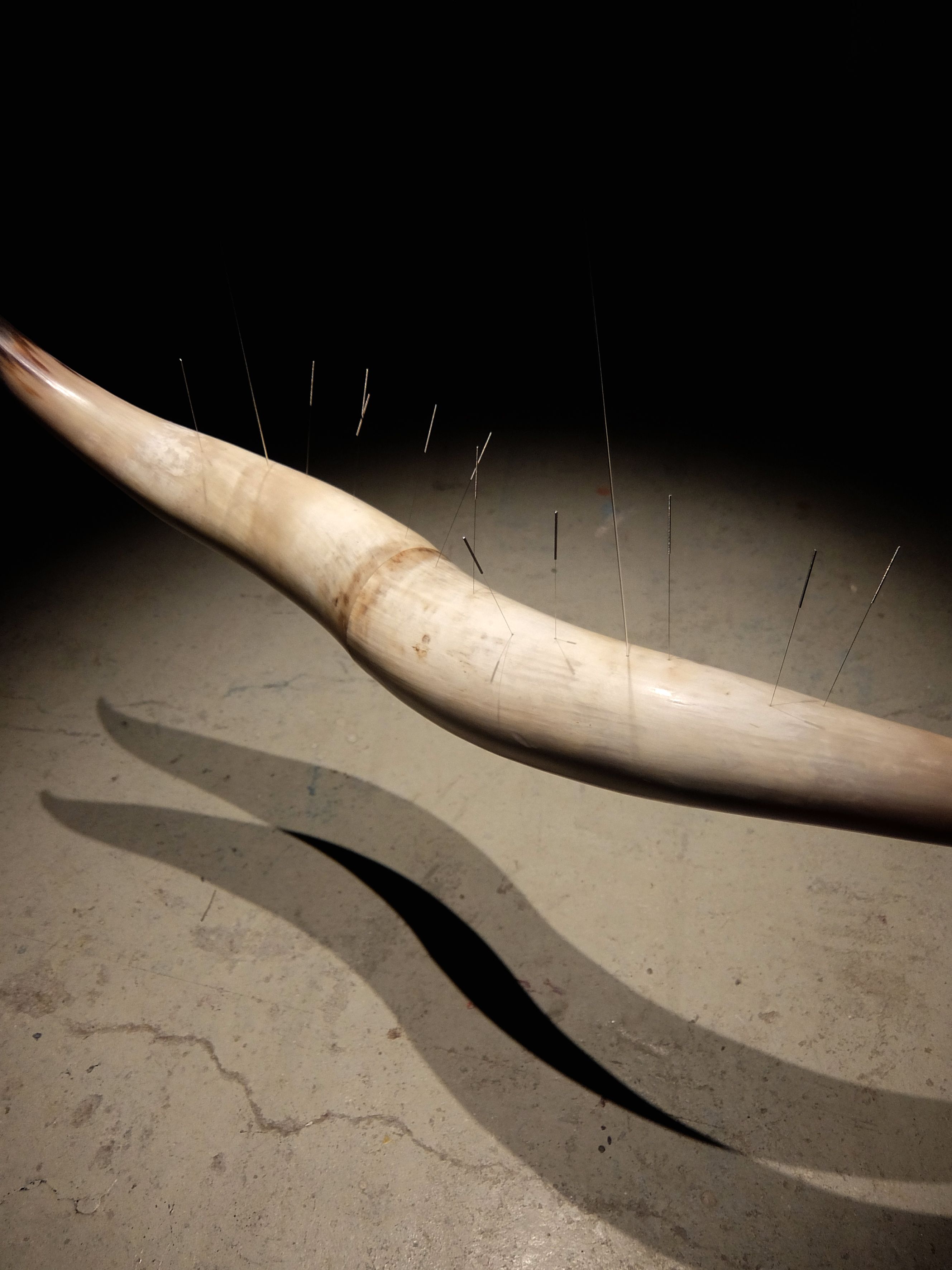Ode 2016. Bull horns, magnets and acupuncture needles. 26 x 95 x 23cm.