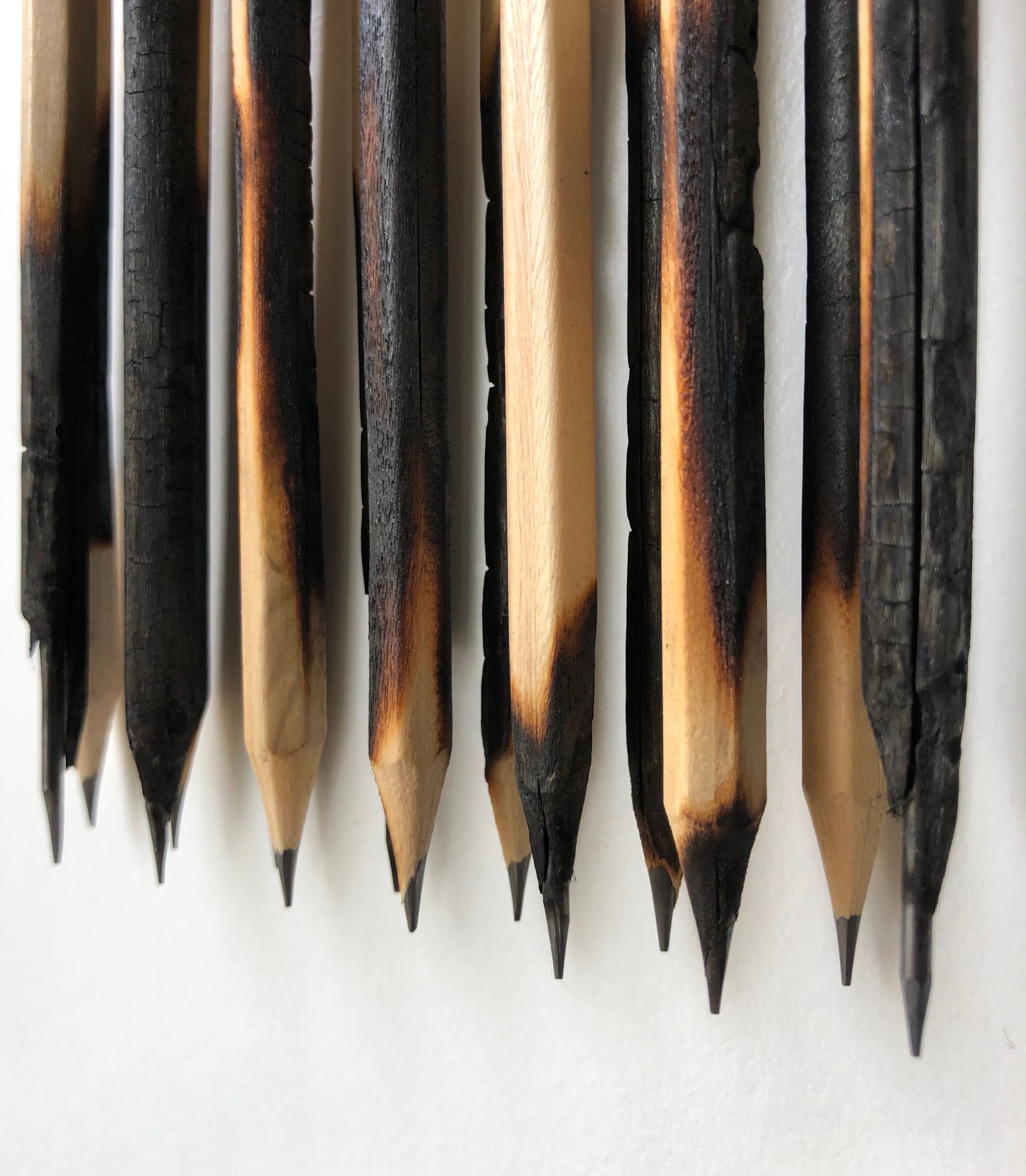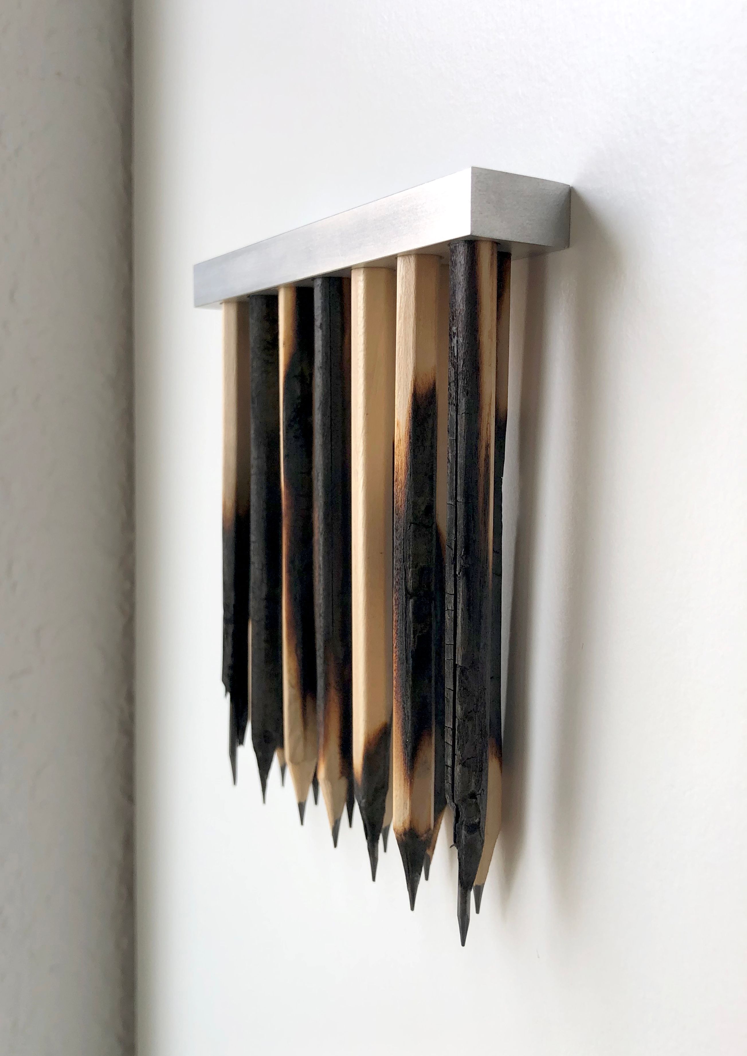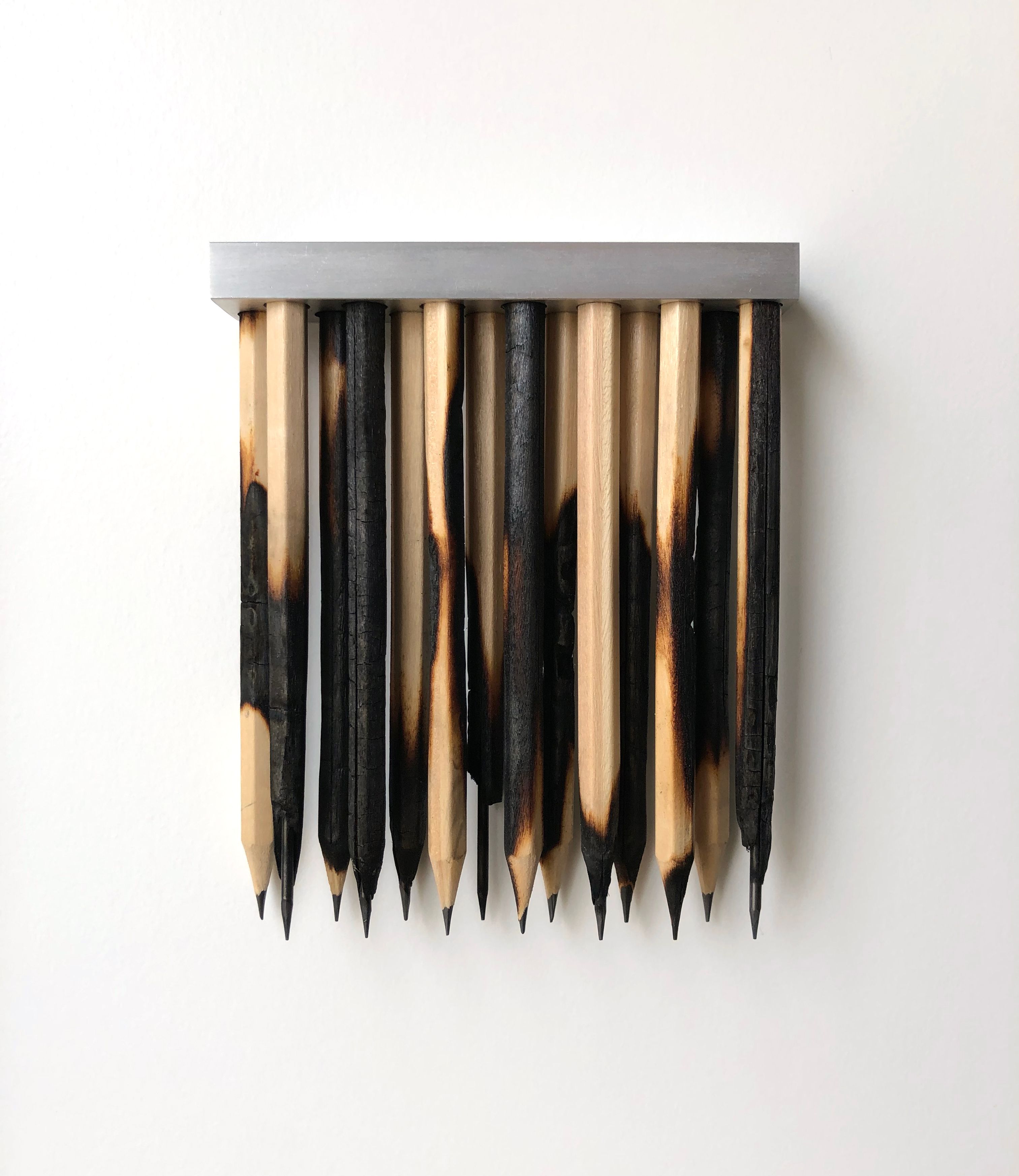The Double Death 2022. Burned pencils and aluminum. 12,5 x 10,2 x 2 cm.